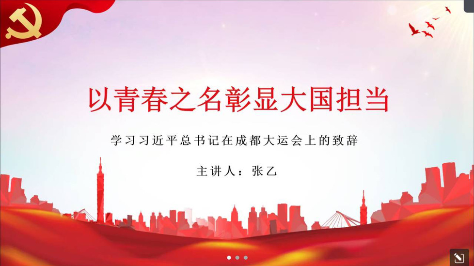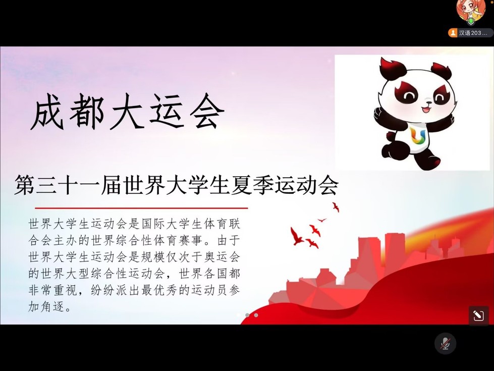 为深刻领悟习近平总书记在第三十一届世界大学生夏季运动会的致辞精神,7月31日下午,周有光文学院学生党支部于线上开展了“以青春之名,彰显大国担当”主题党日活动。