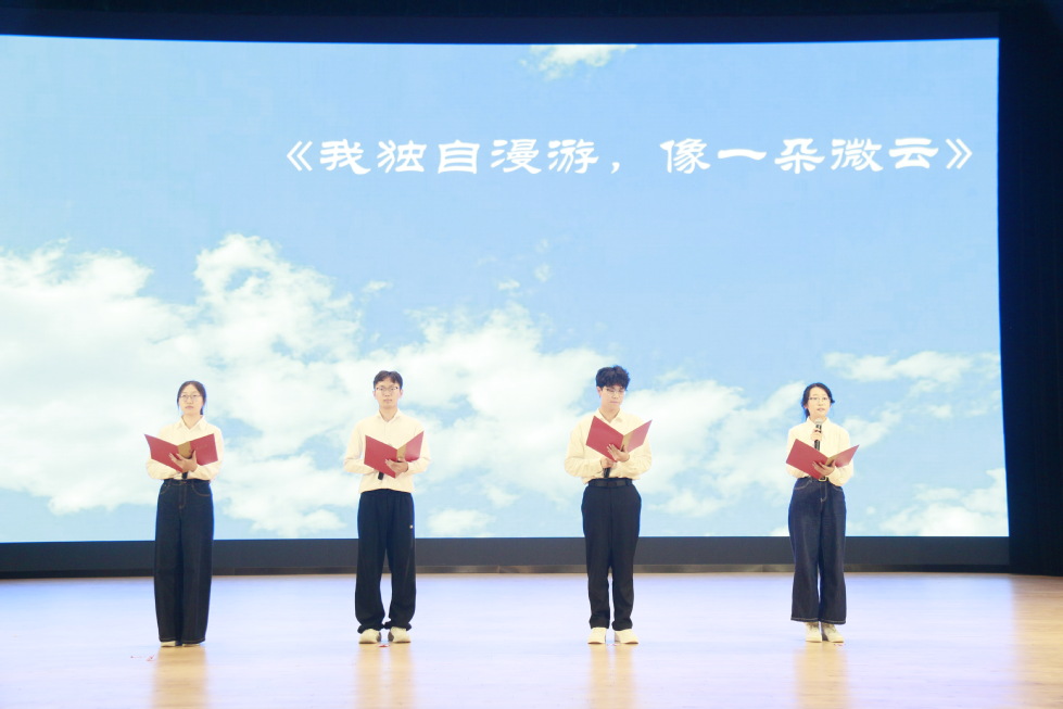 诗朗诵环节,新生代表用中英文朗诵了英国著名诗人、浪漫派诗歌代表人物华兹华斯的诗歌《我独自漫游,像一朵微云》。