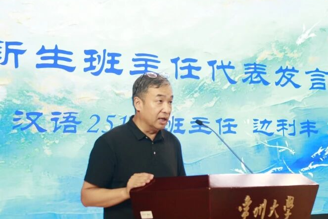 院工会主席、汉语251班班主任边利丰教授代表新生班主任发言。他以“少走弯路”为题,结合自身执教与治学经历,提出“走弯路是现实的必然、成长的代价”,但通过智慧的选择和有效的策略,可以减少挫折和消耗。他建议新生们首先要实现由被动到主动的思维转变,合理规划人生和学业,努力掌握大学专业课程组织运行的底层逻辑,从而实现人生目标。