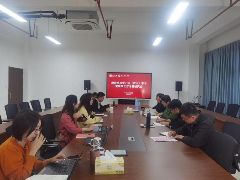 10月23日上午,周有光文学院党委在立言楼334召开理论学习中心组(扩大)学习暨统一战线工作专题会议。会议由学院党委书记焦洁庆主持,学院党委委员、院长助理,党政办主任、组织员,学工办主任、辅导员参加会议。