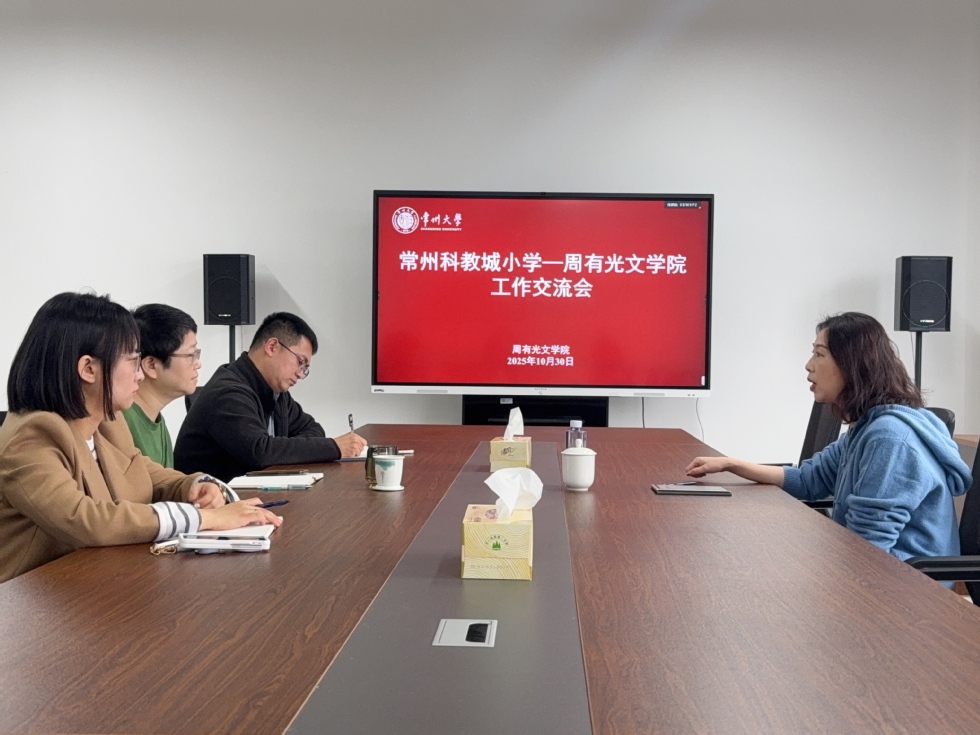 10月30日上午,常州市科教城小学校长卢赟赴常州大学周有光文学院开展合作交流。周有光文学院党委书记焦洁庆、副书记嵇炜、院长助理董文康、专业负责人靳瑞芳等老师参与座谈。