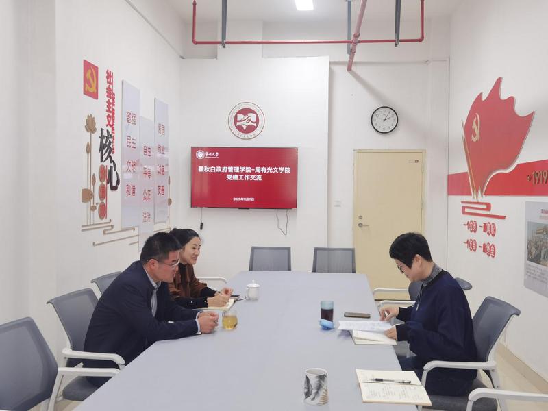 11月11日,瞿秋白政府管理学院党委书记潘道广、组织员范露元一行来我院交流党建工作。周有光文学院党委书记焦洁庆、组织员蒋莉莎参加交流会议。