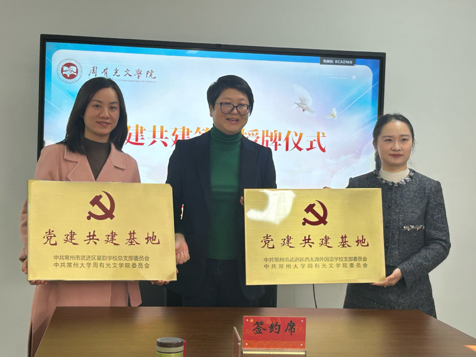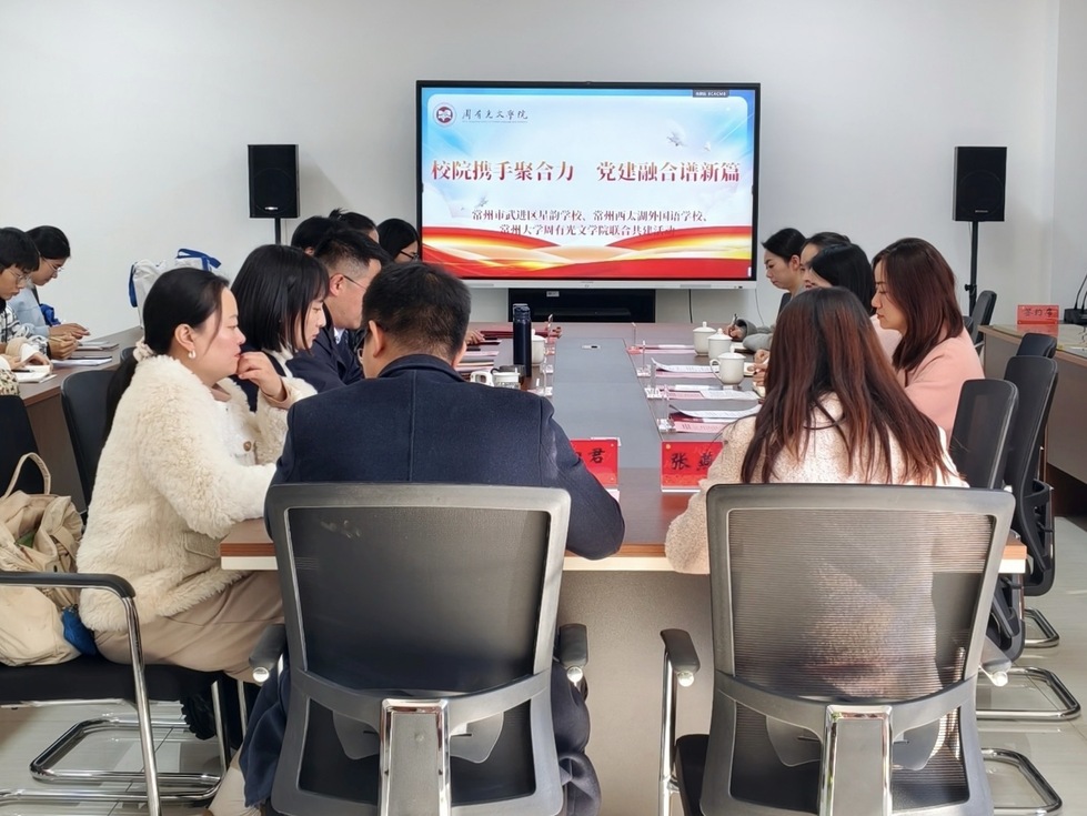 2025年11月19日下午,常州大学周有光文学院与常州市西太湖外国语学校、武进区星韵学校在立言楼334举行联合共建仪式。常州西太湖外国语学校副校长钱颖丹、教师发展中心主任石梦娇;常州市武进区星韵学校课程管理中心主任宋玲瑶、党政办公室副主任史叶琴;常州大学周有光文学院党委书记焦洁庆、院长葛金华、副院长陈鸿、院长助理董文康、古代文学教研室主任王风丽、现当代文学教研室主任何霞、学工办主任张燕红、团委副书记程向君以及学生代表出席仪式。仪式由副书记嵇炜主持。