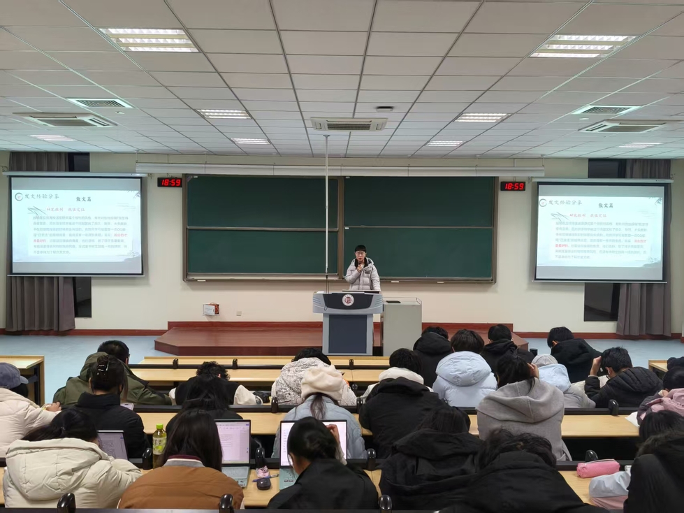 12月21日晚,我院于立德楼四阶成功举办2025年度国奖学子宣讲会。本次宣讲人是我院2025年国奖获得者之一—汉语234班张峻豪,我院汉语251、252班全体学生参加。